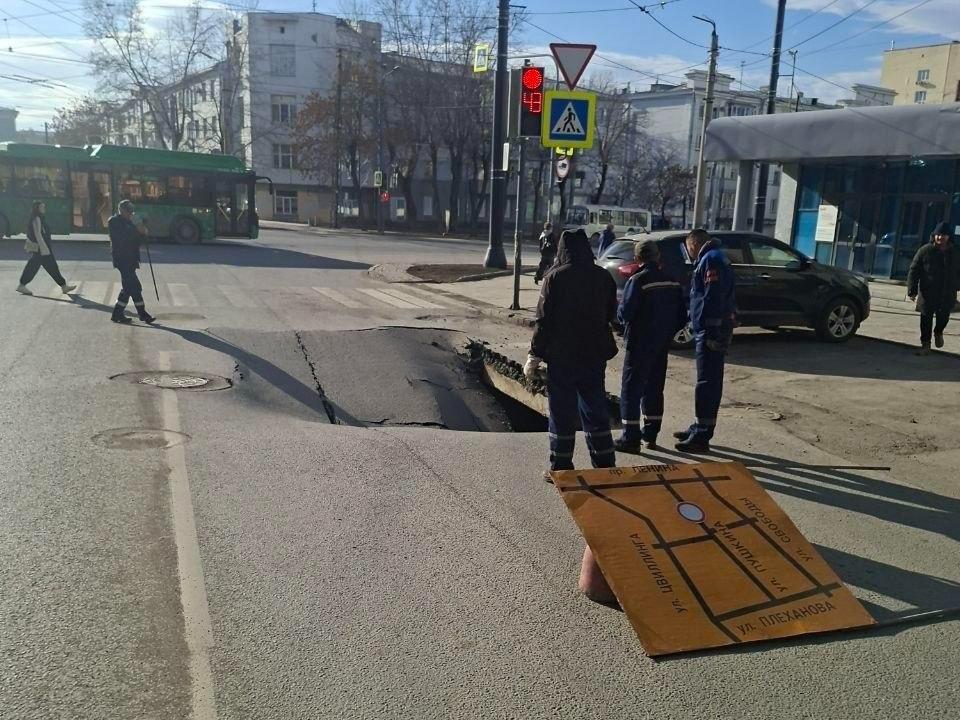 Крупный провал асфальта образовался в центре Челябинска в субботу, 28 марта. Инцидент произошел на пересечении улиц Тимирязева и Свободы, где проезжая часть частично обрушилась, заблокировав целую полосу движения.