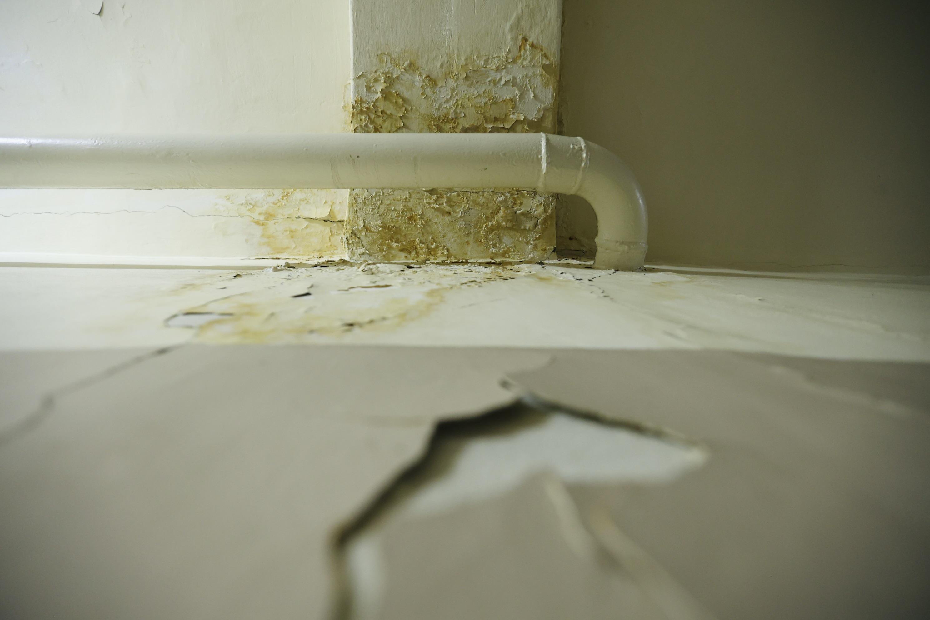 На потолке здания видны многочисленные потеки от протечек.