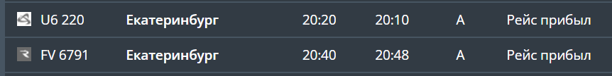 Согласно данным онлайн-табло, на Южном Урале приземлились рейс 220 «Уральских авиалиний» из Сочи и рейс 6791 авиакомпании «Россия» из Красноярска, оба летевшие в Екатеринбург.