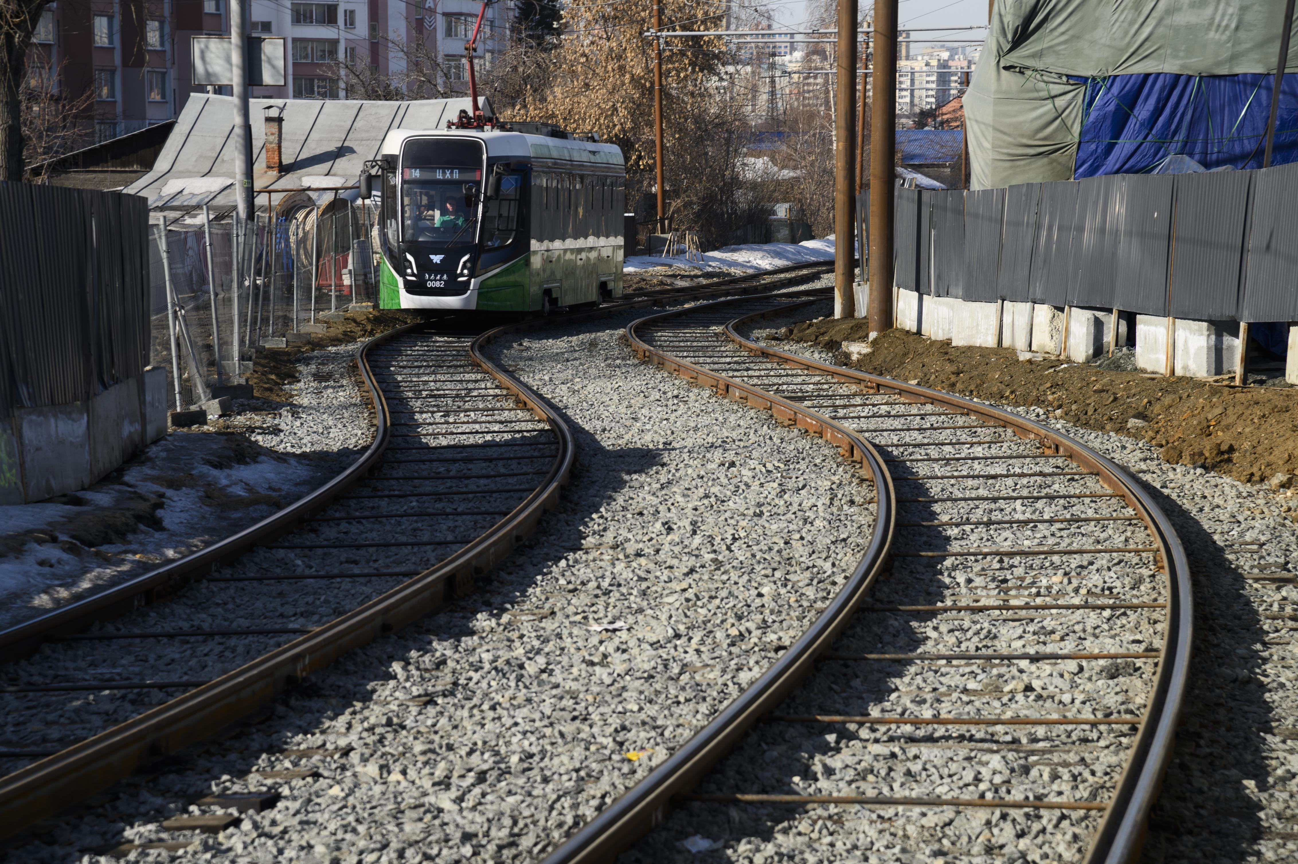 Трамвайное движение организовано рядом со стройплощадкой. Аналогичная схема будет применена и в районе котлована на Каслинской.