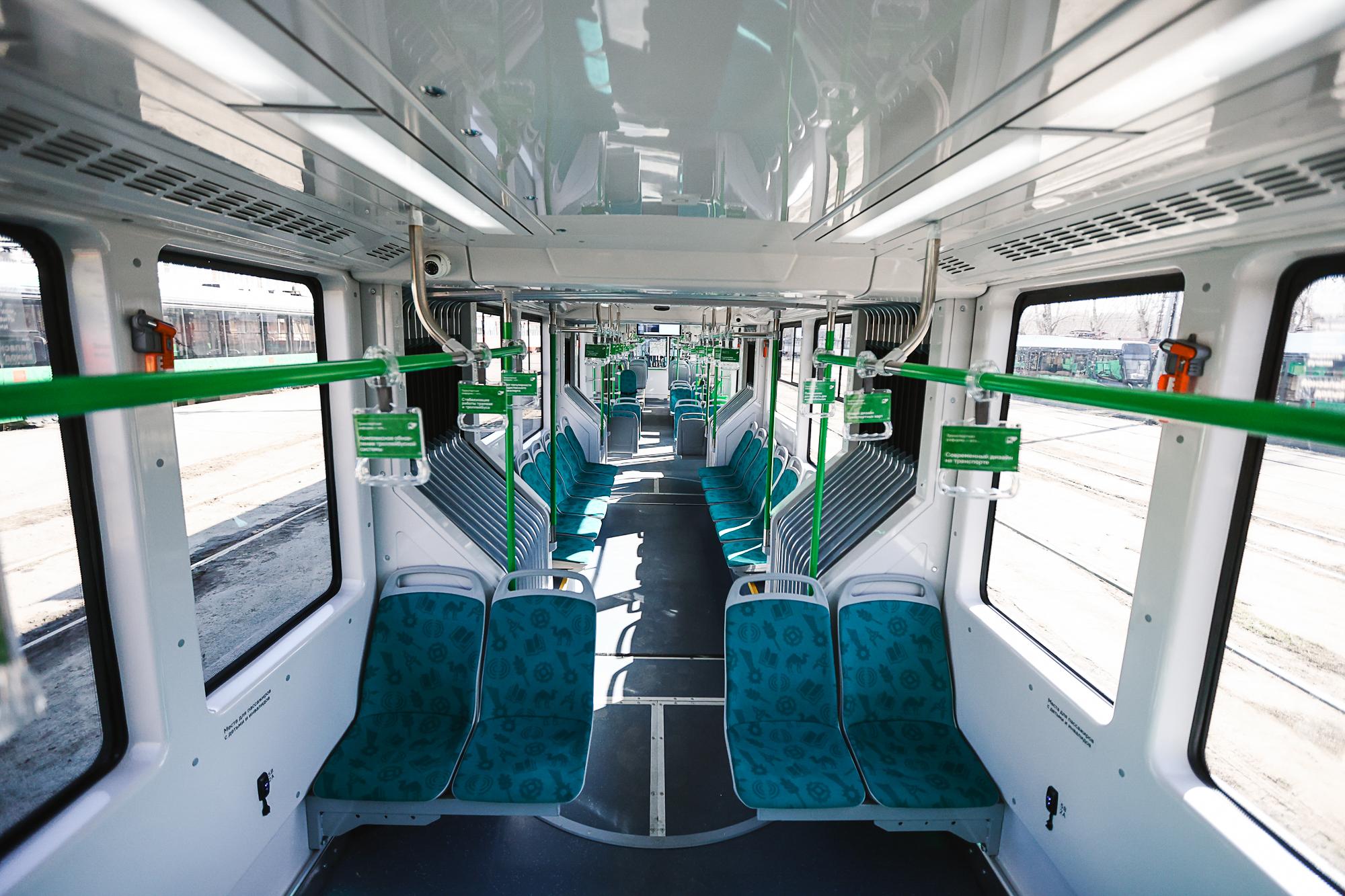Просторный салон трамвая с сидячими местами для пассажиров.