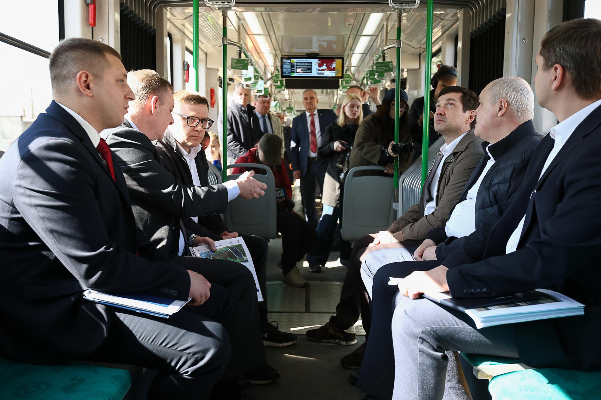 Первые пассажиры нового трамвая, включая руководство региона и города.
