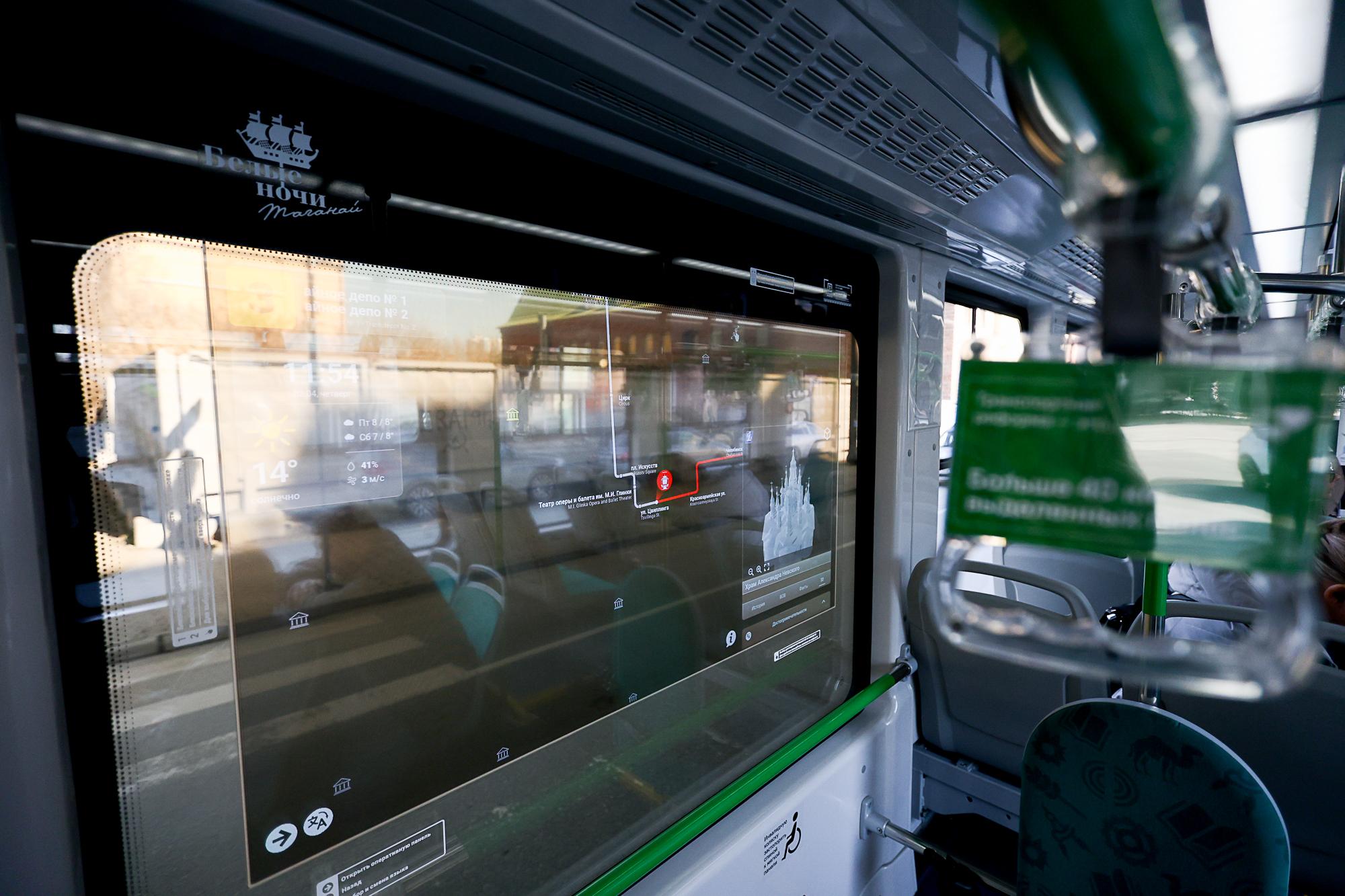 Кроме обычных информационных табло, в салонах установлены две интерактивные сенсорные карты «Белые ночи». Эта петербургская разработка с южноуральской модификацией «Таганай» предназначена для туристов: на ней можно изучить достопримечательности Челябинска и построить маршрут. Также доступен перевод на китайский язык.