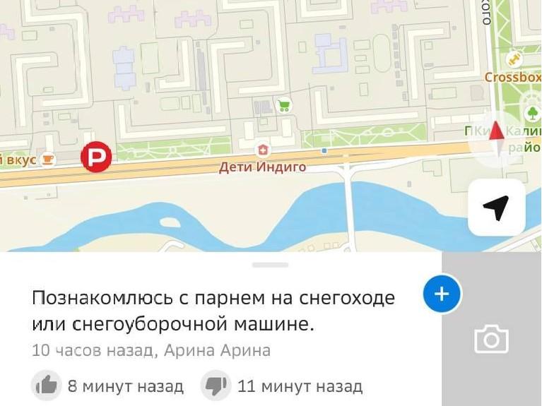 «Познакомлюсь с парнем на снегоходе или снегоуборочной машине», — написала в соцсетях Арина, находясь в пробке на улице Братьев Кашириных.